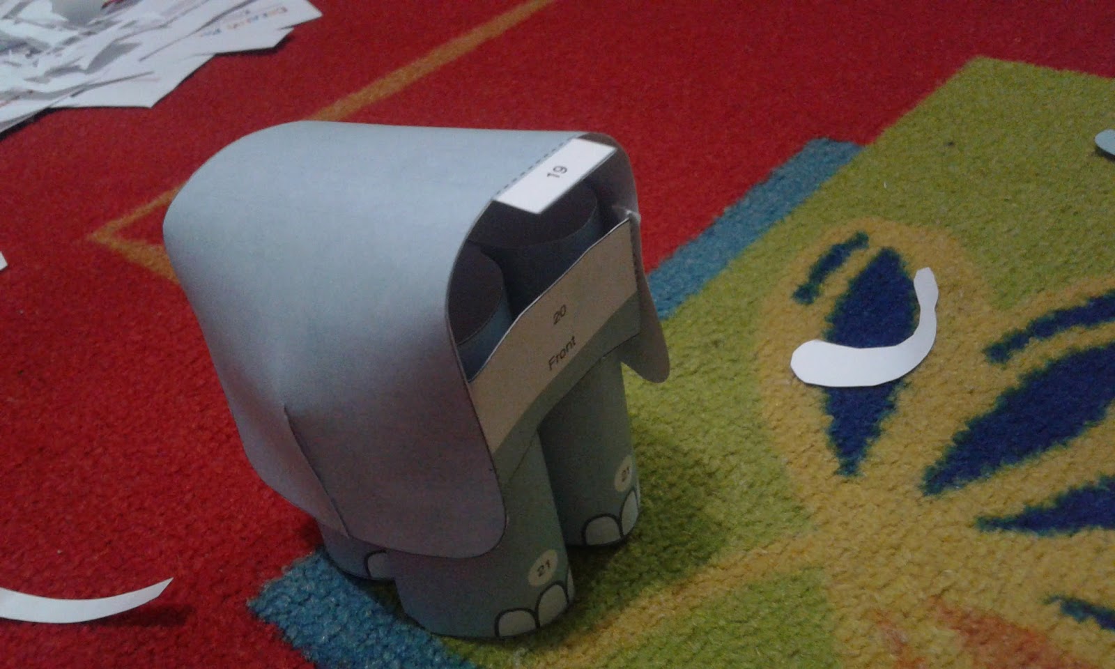 - Pada bagian badan gajah potong bagian yg bernomor 5 yang berwarna merah. Lalu rekatkan dengan menggunakan solasi bolak-balik untuk membuat lekukan pada badan gajah.